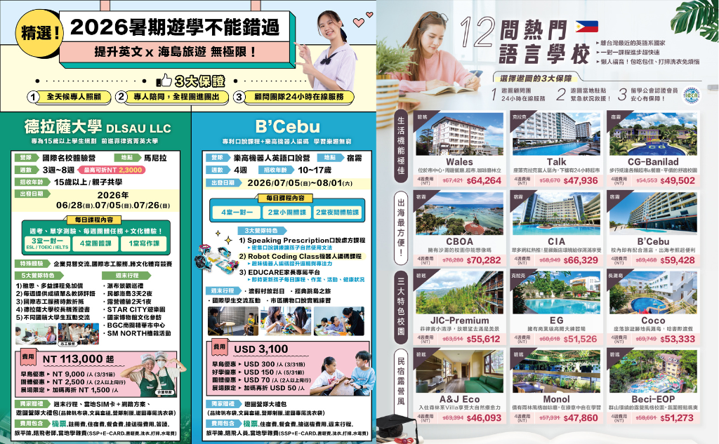 2026暑假遊學優惠,4月台北旅展全面釋出,熱門遊學國家包含菲律賓、澳洲、韓國、美國等多元選擇,無論是語言進修或海外體驗一次滿足。現場提供證件代辦、住宿安排、課程規劃等一站式服務,讓你輕鬆規劃遊學行程、安心出發,搶先卡位最優惠名額!