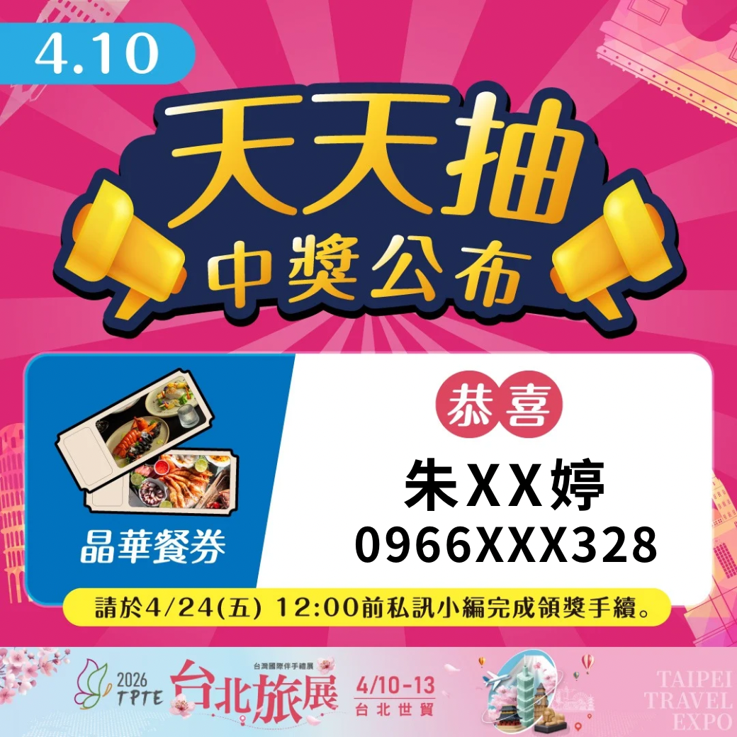 《中獎公告》4/10(五) 逛展天天抽晶華餐券