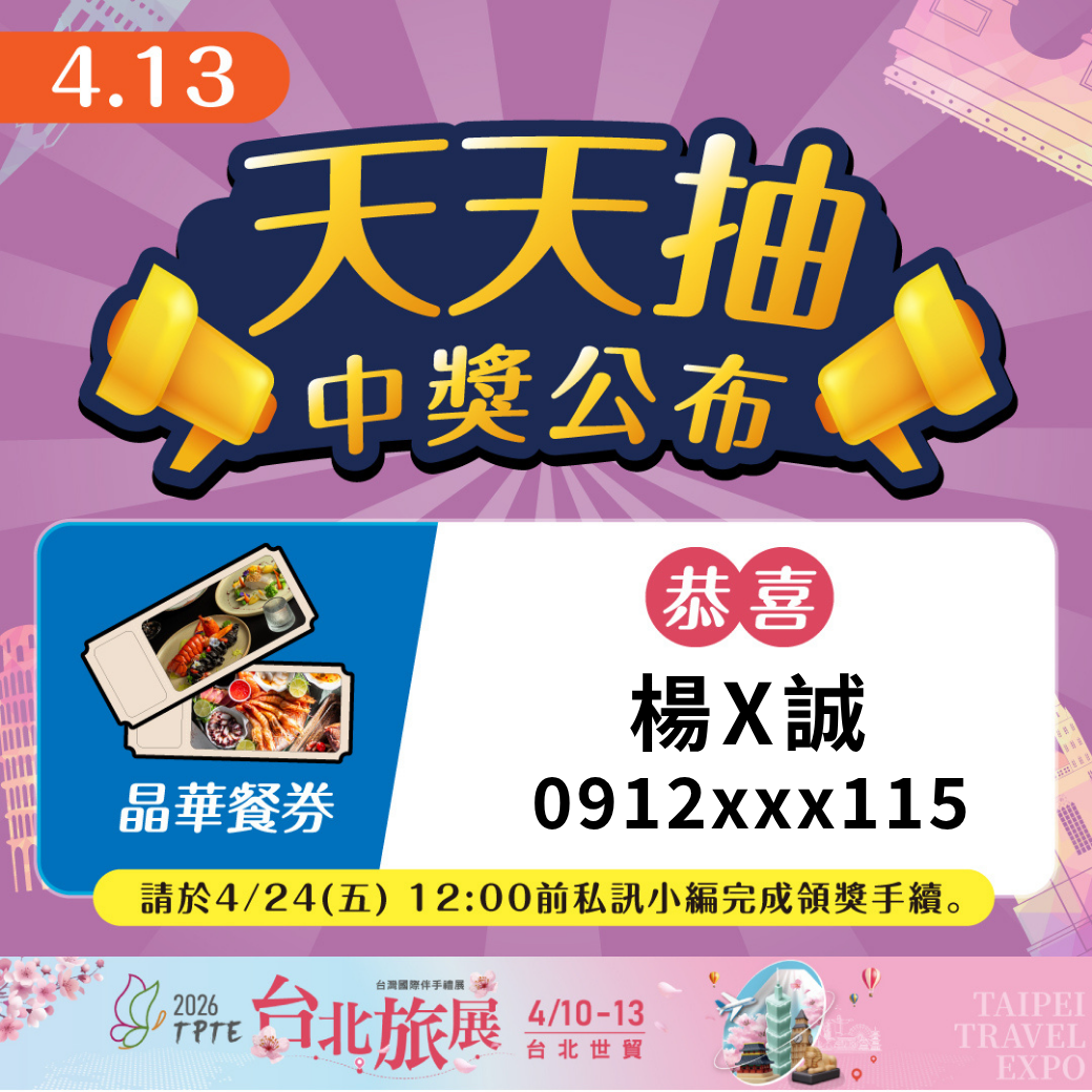 《中獎公告》4/13(一) 逛展天天抽晶華餐券